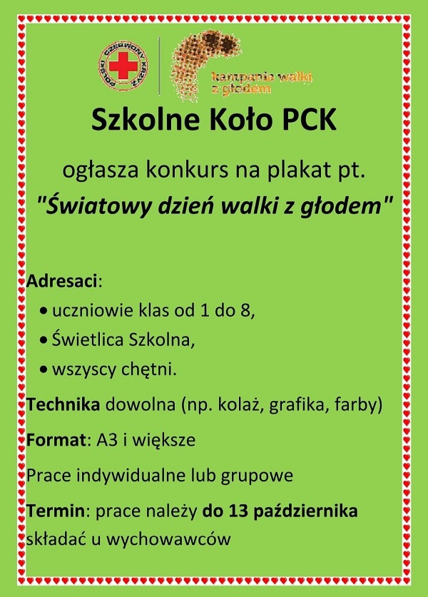 W dniu 16 października obchodzimy Światowy Dzień Walki z Głodem. Z tej okazji SK PCK w naszej szkole ogłosiło konkurs na plakat o tematyce poświęconej brakowi żywności i walce ze skutkami głodu na całym świecie. Wszystkim którzy zaangażowali się w ten konkurs i wykonali piękne plakaty wręczono nagrody i dyplomy. Ich prace zdobiły szkolny korytarz i przypominały o poszanowaniu żywności. |