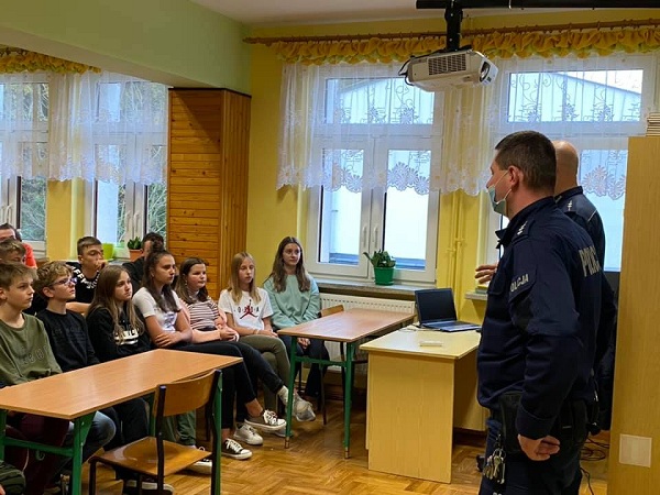 12 października odbyło się spotkanie z policjantami. Zaproszeni goście Pan Tomasz Czelny oraz dzielnicowy Pan Robert Przybyłowicz scharakteryzowali zjawisko cyberprzemocy oraz inne zjawiska wynikające z korzystania z Internetu, omawiali typy zagrożeń i uczyli, jak należy postępować i na co zwracać uwagę w takiej sytuacji. Nasi goście scharakteryzowali zjawisko cyberprzemocy, które może wyrządzić ogromne szkody i o odpowiedzialności prawnej dzieci i młodzieży. Omówiono również tematykę związaną z zabezpieczaniem dostępu do swoich kont na portalach społecznościach oraz poczty w celu zapobiegania włamaniom i ochroną swoich danych osobowych. Policjant radził, co robić żeby nie zostać ofiarą cyberprzemocy, jak postąpić będąc świadkiem takiej formy przemocy oraz gdzie szukać pomocy, gdy staniemy się ofiarą agresji w sieci. Ofiary lub świadkowie cyberprzemocy powinni szukać wsparcia – porozmawiać z rodzicami, pedagogiem, wychowawcą bądź inną osobą dorosłą. Razem łatwiej rozwiązać problem. Niebezpiecznym zjawiskiem, na które zwrócił uwagę jest hakowanie, na które narażeni są nie tylko dorośli. W bardzo przystępny sposób objaśniał uczniom, na co mają zwrócić uwagę, namawiał do czujności i rozwagi w udostępnianiu swoich danych przez Internet. Udzielił cennych rad, jak można się ustrzec przed hakerami. Uświadomił na jakie nieprzyjemności możemy być narażeni. Zachęcał do szybkiej reakcji na każdą przestępczość w Internecie i do informowania o wszystkim rodziców. Zwracał również uwagę na ostrożność w nawiązywaniu kontaktu na forach internetowych, przestrzegał przed ujawnianiem swoich danych osobom nieznajomym. Ostatnim groźnym zjawiskiem, na które zwrócił uwagę pan Tomasz jest hejtowanie innych. Mowa nienawiści płynąca z Internetu jest również rodzajem przemocy, na którą trzeba reagować, zgłaszając rodzicom, wychowawcom, nauczycielom. Taka reakcja przynosi efekty, ponieważ w sieci nikt nie jest anonimowy. |
