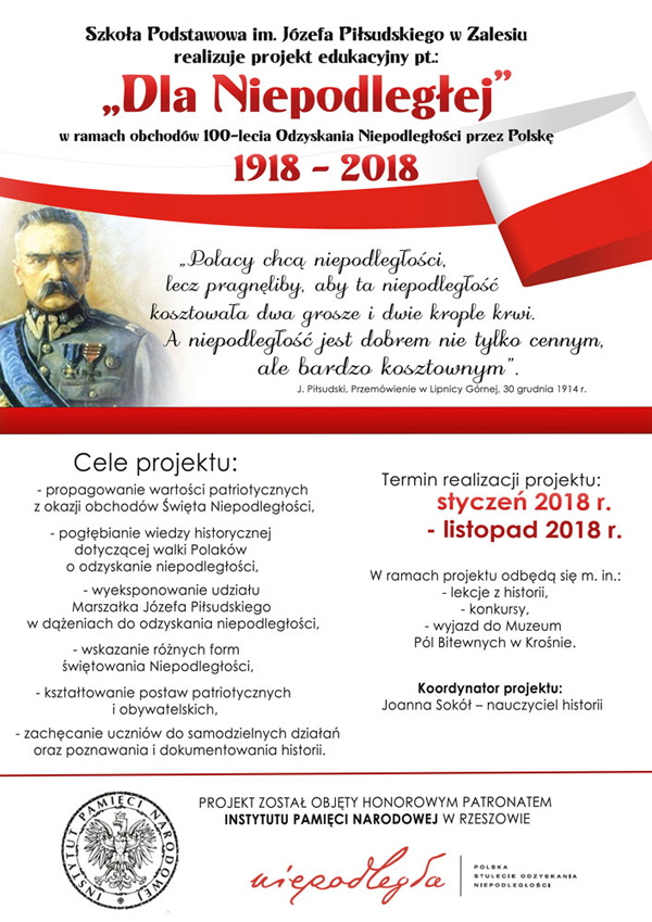 edukacyjny „Dla Niepodległej” Kolejne działanie w naszym projekcie edukacyjnym „Dla Niepodległej” to konkursy. Jeden z nich to konkurs plastyczny pt.: „Wokół symboli narodowych”, który skierowany jest do uczniów z klas I – III. Polega na wykonaniu pracy autorskiej w dowolnej technice plastycznej o tematyce związanej z symbolami narodowymi np. dowolnie wybrane godło Polski począwszy od godła Piastów do współczesności lub flaga narodowa. Dla klas starszych od IV – VII przewidziane są dwa konkursy. Jeden z nich to konkurs multimedialny pt.: „Marszałek Józef Piłsudski - niezłomny bojownik o wolność Polaków”. Konkurs polega na przygotowaniu prezentacji multimedialnej w programie PowerPoint. Drugi konkurs „Wiedzy o marszałku Józefie Piłsudskim” w formie pisemnej odbędzie się w dniu 7 czerwca na terenie szkoły. Szczegóły dotyczące konkursów znajdują się w załącznikach. Zapraszamy wszystkich uczniów do aktywnego włączenia się w obchody rocznicy 100- lecia naszej Niepodległej. Materiały do pobrania: