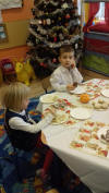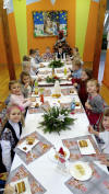 Wigilijne Święta Bożego Narodzenia to najbardziej rodzinne, a zarazem najbardziej ukochane przez dzieci dni w roku. Rozpoczyna je Wigilia, szczególnie uroczysty i wzruszający wieczór, pełen miłości i rodzinnego ciepła, radości a także zadumy i refleksji. Również w naszej grupie 5-6 - latków oraz w przedszkolu 3,4- latków odbyła się uroczysta Wigilia. Rozpoczęła się modlitwą, dzieleniem się opłatkiem, składaniem sobie życzeń i wspólnym kolędowaniem przy pięknie przystrojonych stołach i choince. Potem wszyscy wspólnie zasiedli przy stole, by spróbować tradycyjnych wigilijnych potraw: barszczu, pierogów i pierniczków. Cała uroczystość przebiegła w bardzo miłej atmosferze, ponieważ tego typu spotkania niosą zawsze ze sobą radość i uśmiech dziecka, wprowadzają świąteczny nastrój.
