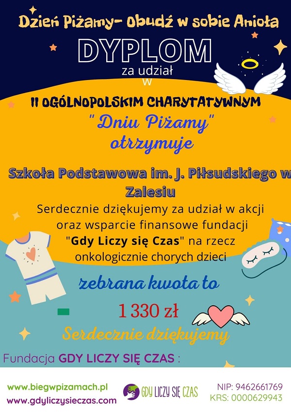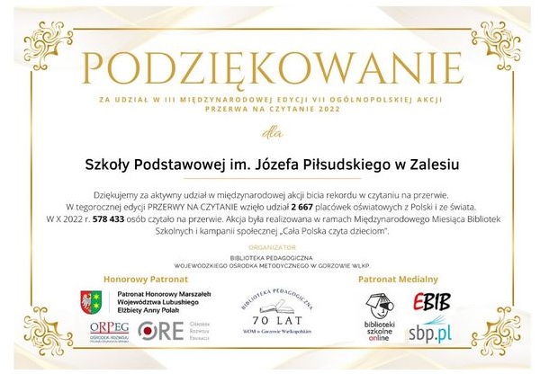 Ten dzień w Szkole Podstawowej im. Józefa Piłsudskiego w Zalesiu był szczególny, gdyż odbyło się ślubowanie i pasowanie pierwszoklasistów. Na uroczystość przybyli nauczyciele, dyrekcja szkoły, rodzice oraz przedstawiciele uczniów klas starszych. Dzieci klasy pierwszej pod kierunkiem wychowawczyni oraz z pomocą starszych kolegów i koleżanek przygotowały część artystyczną, podczas której zaprezentowały swoje umiejętności recytatorskie i wokalne. Uczniowie wykazali się wiedzą na temat ojczyzny, symboli narodowych oraz zachowania w ruchu drogowym. Wiedzą jak pracować, uczyć się i zachowywać w szkole. Dzieci wzorowo zdały egzamin pierwszoklasisty. Na sztandar szkoły ślubowały, że będą kochać swoją ojczyznę, będą szanować swoich nauczycieli, rodziców i kolegów oraz strzec honoru i dobrego imienia szkoły. Ważnym elementem uroczystości było pasowanie na ucznia, którego dokonała Pani Dyrektor, dotykając ramienia pierwszaków dużym ołówkiem. Pierwszoklasiści zostali przyjęci do grona uczniów naszej szkoły. Otrzymali pamiątkowe dyplomy od wychowawcy, a od rodziców książeczkę „Julian Tuwim dla dzieci”. Po części oficjalnej odbył się słodki poczęstunek przygotowany przez rodziców. Uczniom klasy pierwszej życzymy samych sukcesów w nauce, wytrwałości w pokonywaniu trudności, dobroci oraz życzliwości od dorosłych i rówieśników oraz samych radosnych chwil spędzonych w murach naszej szkoły. Niech szkoła będzie dla nich „drugim domem”, w którym będą się czuć bezpiecznie, i tak jak w zaśpiewanej przez pierwszaków piosence „nie spotka ich nic złego”.