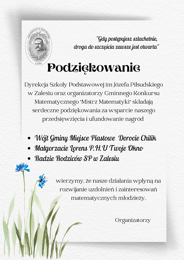 Powiatowy Konkurs Matematyczny Miło nam poinformować, iż uczeń klasy 8 Mateusz Najbar wywalczył awans do finału IV Powiatowego Konkursu Matematycznego im. Ignacego Łukasiewicza. Finał odbędzie się w Zespole Szkół Naftowo-Gazowniczych im. Ignacego Łukasiewicza w Krośnie w dniu 31 maja 2023 r. Mateuszowi gratulujemy i życzymy dalszych sukcesów. Pozostałym uczniom, którzy podjęli wyzwanie zmagania się z zadaniami konkursowymi dziękujemy za rywalizację i zapraszamy do udziału w kolejnych konkursach matematycznych. |