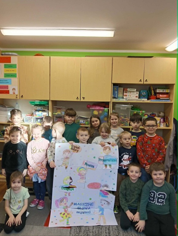 W grudniu dzieci z oddziału 5–6-latków uczestniczyły w zajęciach promujących kulturę dobrego słowa. Przedszkolaki z dużym zainteresowaniem wysłuchały opowiadania „O Zosi i pięciu magicznych słowach”, a następnie pięknie odpowiadały na pytania, wykazując się świetnym zrozumieniem treści. Na zakończenie zajęć dzieci stworzyły kolorowankę „Magiczne słowa”, utrwalając w ten sposób zasady uprzejmej i życzliwej komunikacji. To był czas pełen rozmów o szacunku, empatii i mocy dobrych słów.