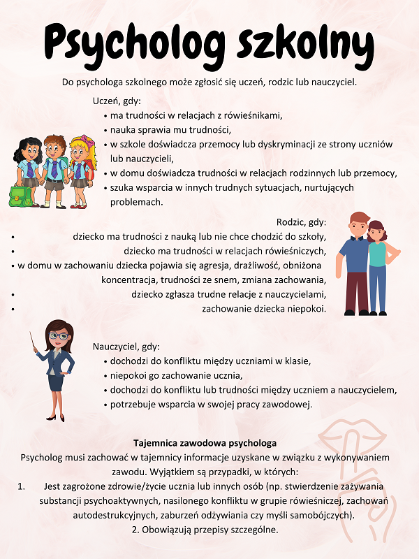 W roku szkolnym 2025/2026 funkcję psychologa szkolnego, pełni p. Jolanta Zacharska (w zastępstwie za p. Aleksandrę Kościółek). Zajęcia odbywają się w wymiarze 11 godz. tygodniowo wg harmonogramu: